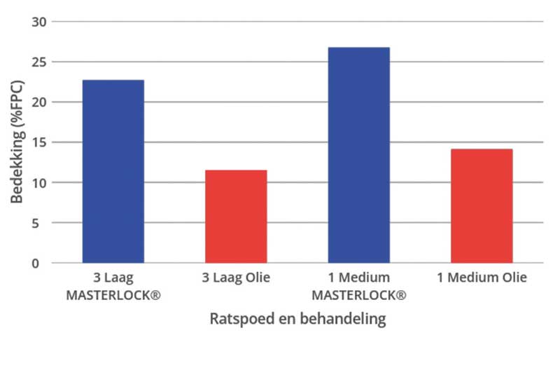 Om die resultate te evalueer is UVIEW (fluoresserende kleurstof) saam met die byvoegmiddels in die tenk gevoeg en die resultate is met die DROPSIGHT-toepassing bevestig. Die gemiddelde bedekking (“percentage fluorescent particle coverage” of %FPC) wat verkry is met MASTERLOCK® was amper dubbel dié van olie. MASTERLOCK® het ook beter bedekking gebied teen die laer watervolume versus die hoë volume (sien Figuur 1).